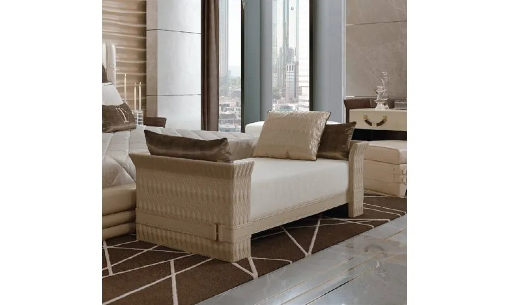 Банкетка с деревянным основанием и кожаной обивкой. Сиденье может быть выполнено в тканевом или кожаном чехле.