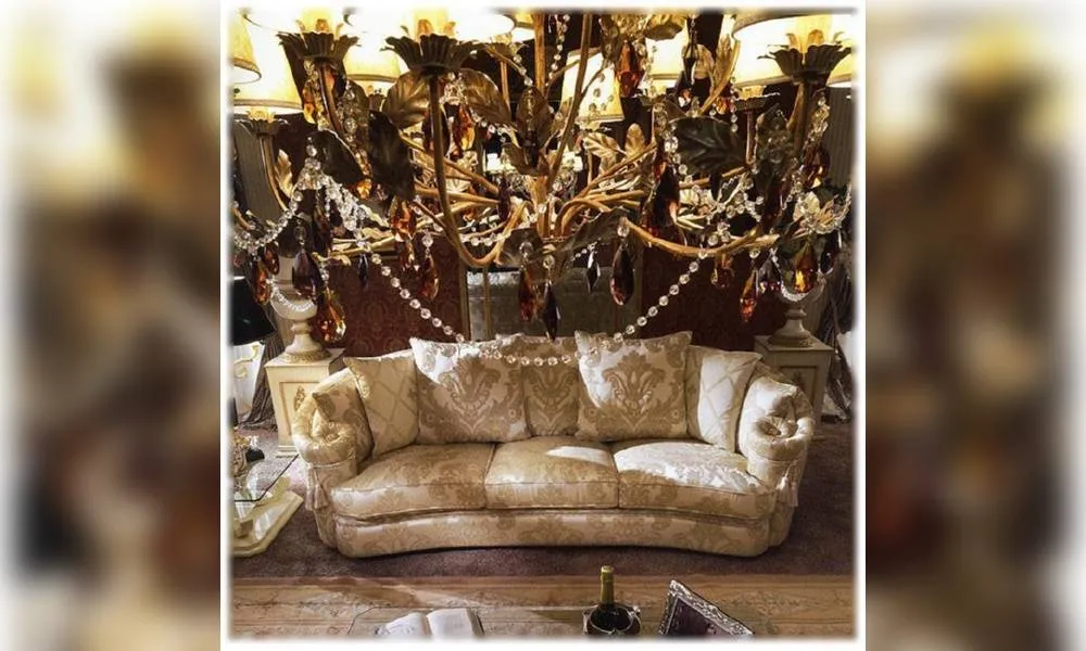 3-х местный диван с закругленной спинкой плавно переходящей в подлокотники. Золоченые ножки. Наполнение - полиуретан. Декор ручной работы. Возможны другие цветовые варианты обивки.