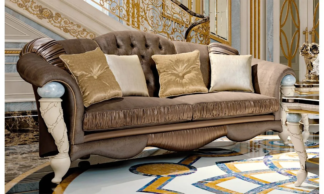 Диван на деревянном основании, декорирован резьбой. На подлокотниках установлены мраморные сферы, ножки выполнены с матовым финишем. Обивка может быть из кожи разных видов.