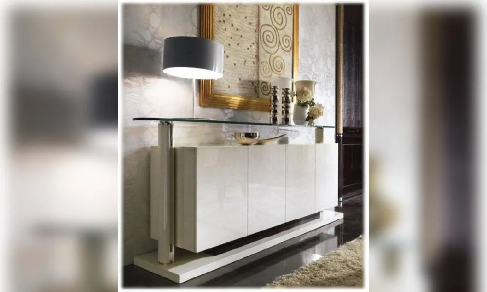 4-х дверный комод. Декор ручной работы. Овальная стеклянная столешница. Возможны другие цветовые варианты отделки и декоративные элементы с аппликациями из кожи.