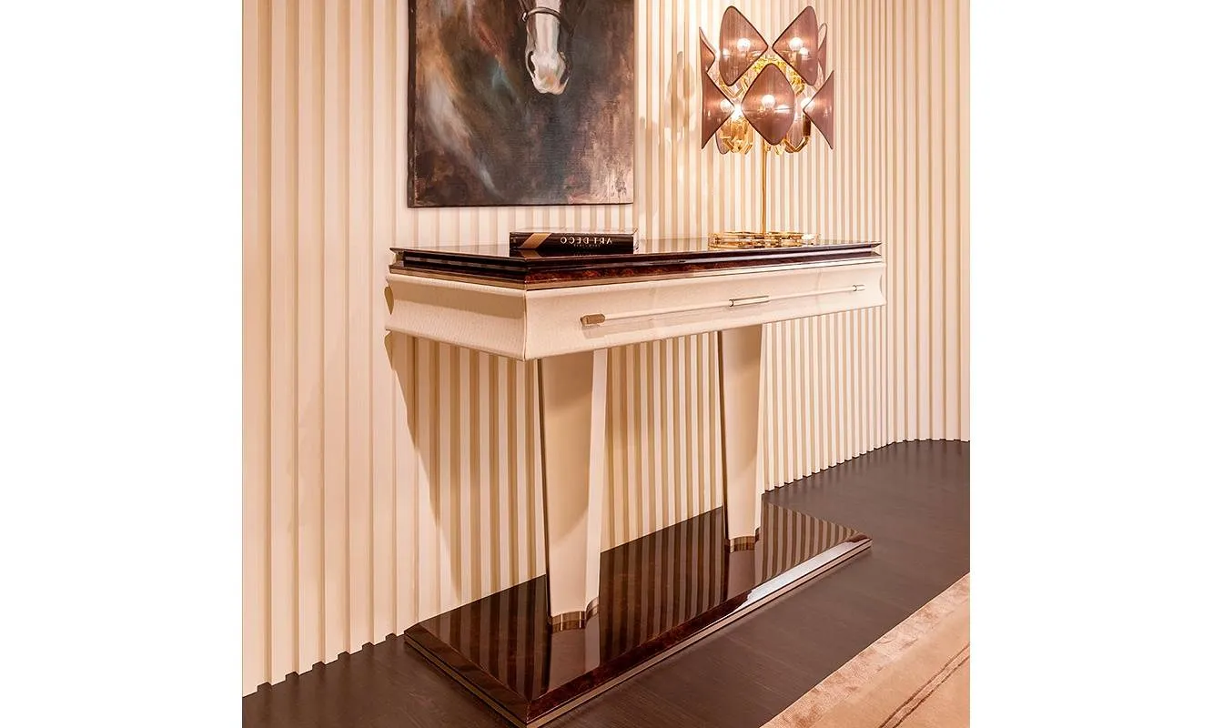 Консоль на деревянном основании с металлическими вставками. Имеет ящик, обитый кожей. Возможны другие варианты отделки и обивки.