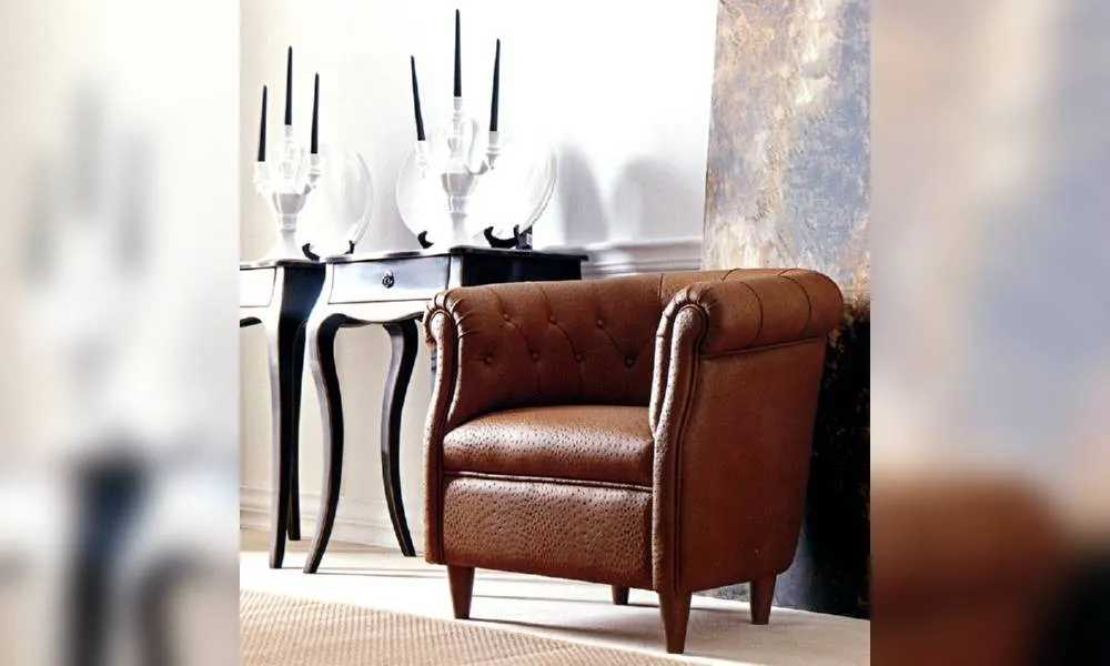 Кресло в коже, спинка расположена на одном уровне с подлокотниками. Наполнение - полиуретан. Возможны другие варианты обивки.