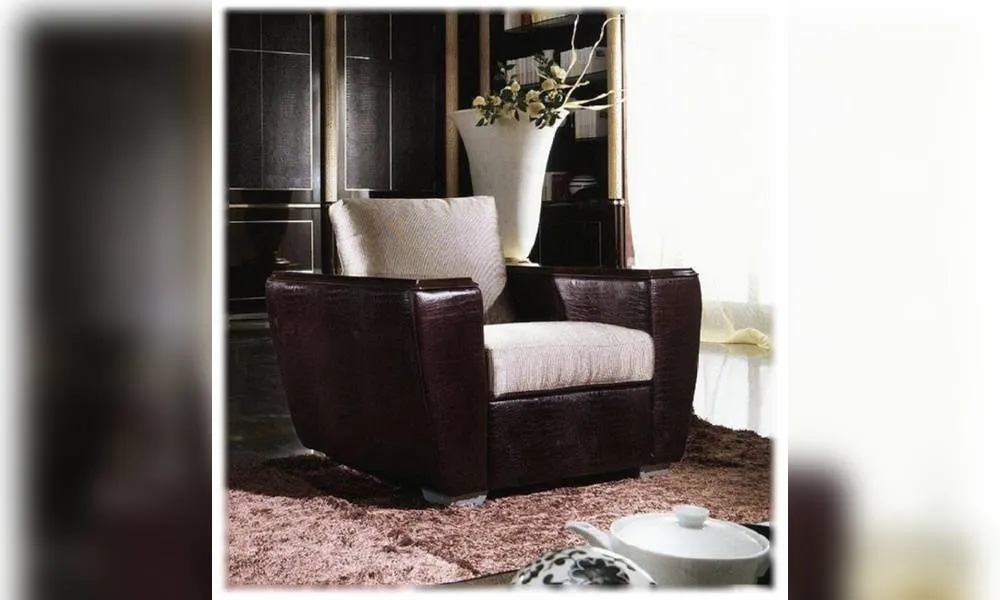 Кресло. Деревянные подлокотники и задняя часть. Наполнение - полиуретан. Подушки для сиденья и спинки из ткани. Декор ручной работы. Возможны другие цветовые варианты отделки и кожи.