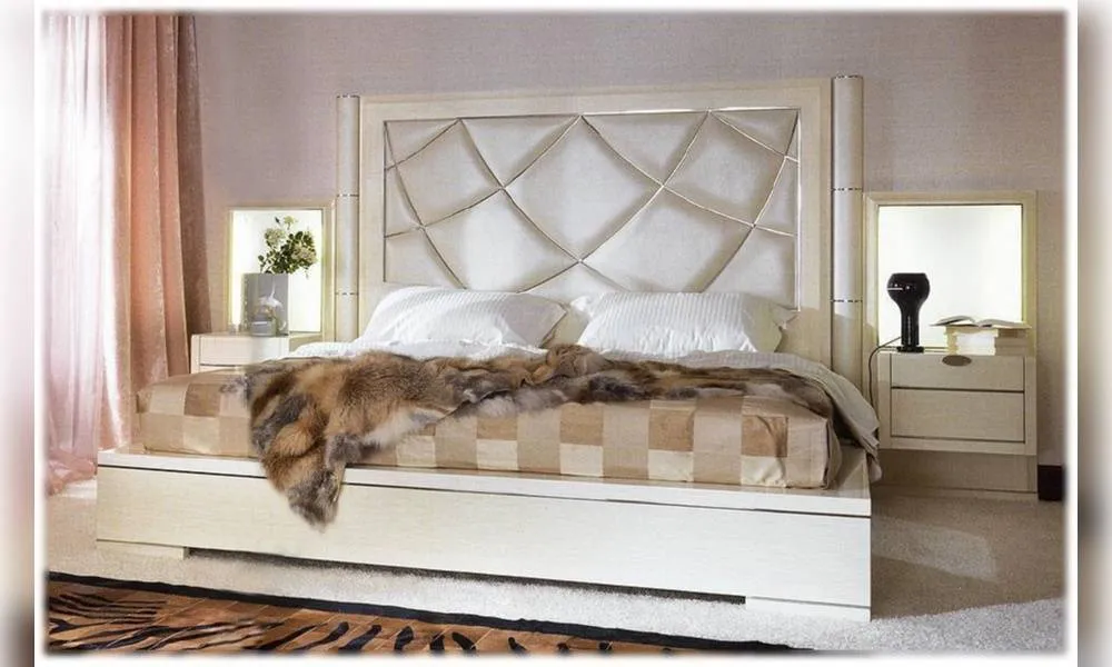 Двуспальная кровать. Высокое и мягкое изголовье (кожа) с хромированными металичискими вставками, без изножья. Декор ручной работы. Возможны другие цветовые варианты отделки и обивки.