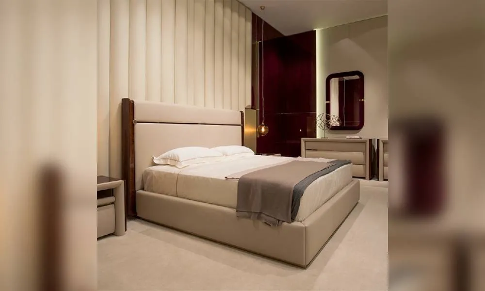 Двуспальная кровать с обитыми изголовьем и основанием. Возможны другие варианты обивки.