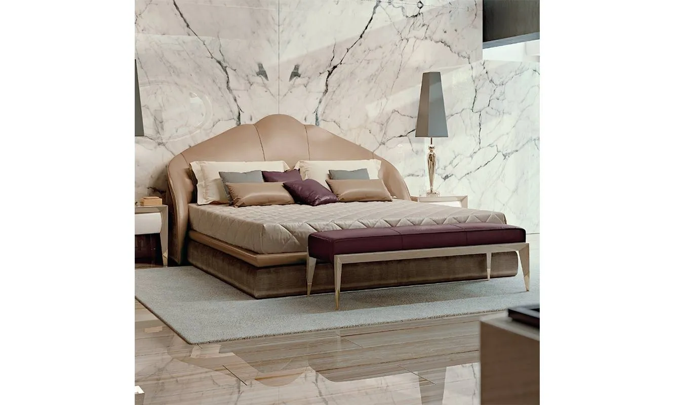Кровать с мягким изголовьем, которое может быть обито в ткань или кожу разных видов. Стеганое покрывало. Декоративные подушки доступны по запросу.