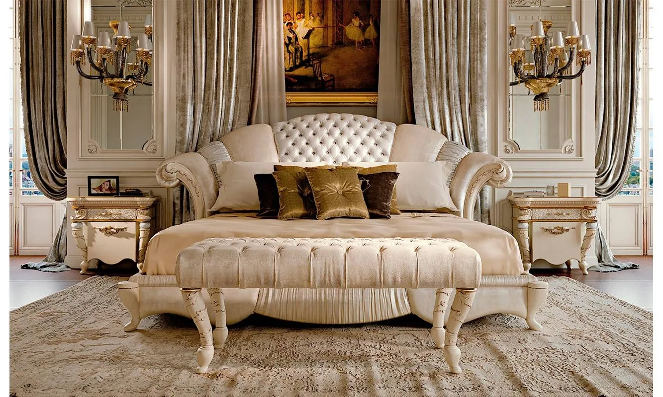 Кровать с резными деревянными ножками. Обивка изголовья может быть выполнена из ткани разных видов. Матрас и решетка в цену не включены.