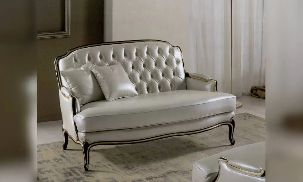 Двухместная софа. Спинка обита в технике капитоне. Возможны другие варианты отделки и обивки, в том числе в ткани клиента.