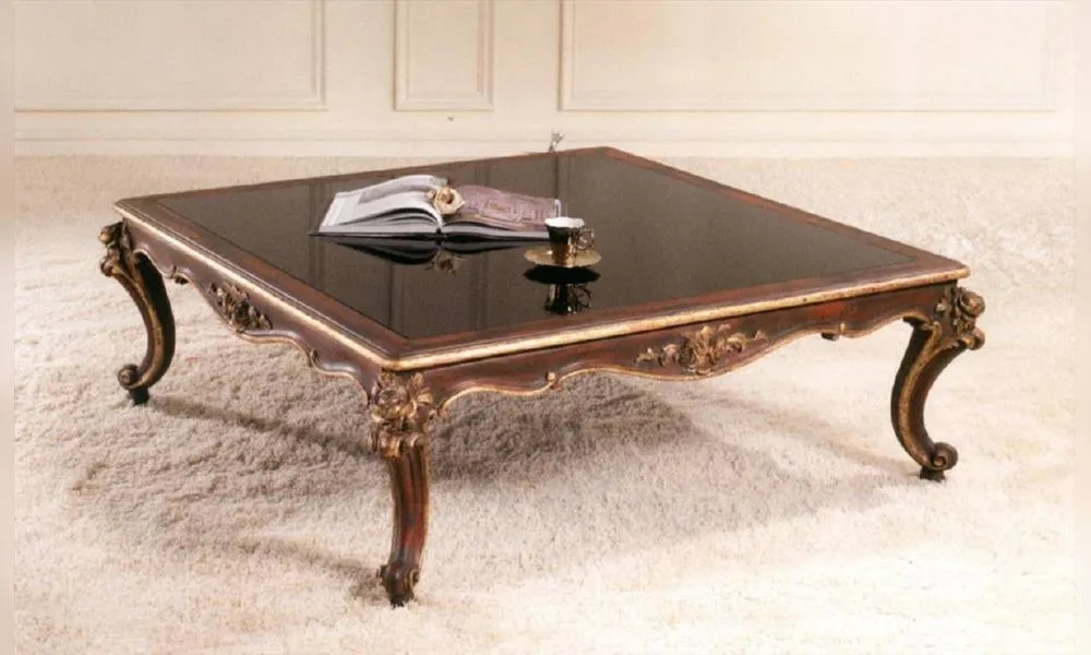 Квадратный журнальный стол. Столешница выполнена из стекла. Декорирован резными элементами.