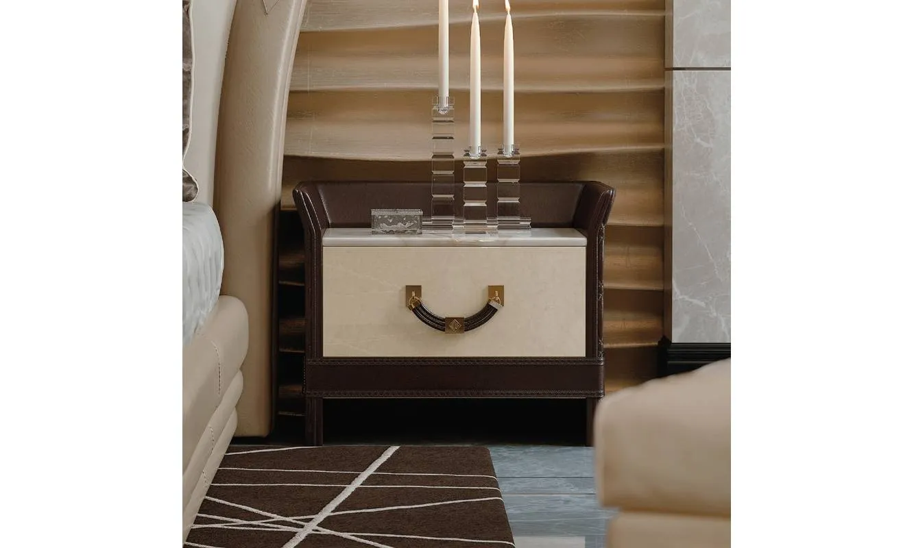 Прикроватная тумбочка со структурой из дерева. Частично обита кожей. Возможен заказ изделия с мраморной столешницей и другие варианты отделки и обивки.