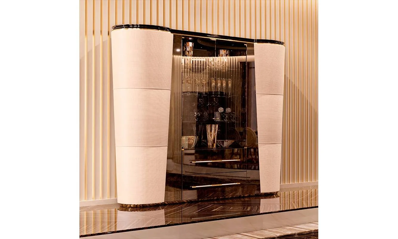 Витрина с ящиками и двумя вращающимися элементами, обитыми кожей. Структура выполнена из дерева. Дверцы стеклянные. Основание выполнено из металла. Возможны другие виды отделки и обивки. Комплект светодиодного освещения включен в стоимость.
