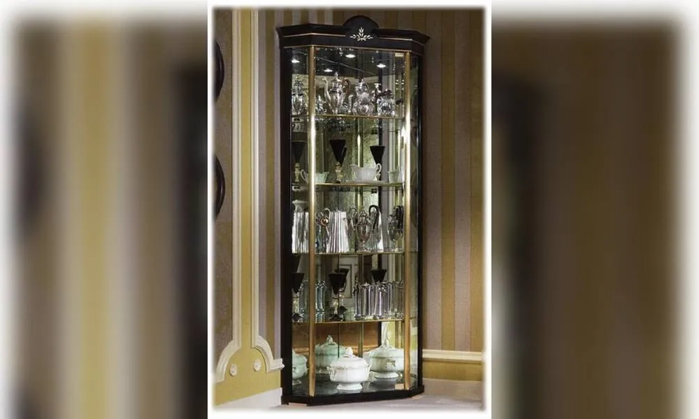 Угловая витрина с 1-ой дверцей из закаленного стекла с вертикальным фацетом. Зеркальная задняя стенка. Внутренние полки выполнены из стекла. Галогеновая подсветка в верхней плоскости по желанию заказчика. Декор ручной работы. Возможны другие цветовые варианты отделки.