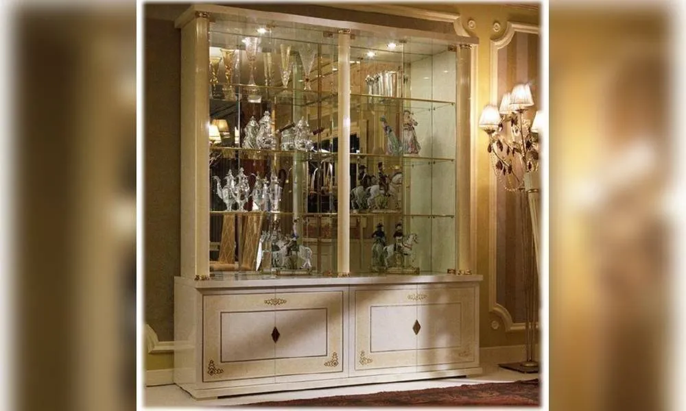 4-х дверная витрина, верхняя часть со стеклянными дверцами. Зеркальная задняя стенка. Внутренние стеклянные полки с декоративным латунным профилем. Галогеновая подсветка в верхней плоскости по желанию заказчика. Декор ручной работы. Возможны другие цветовые варианты отделки.