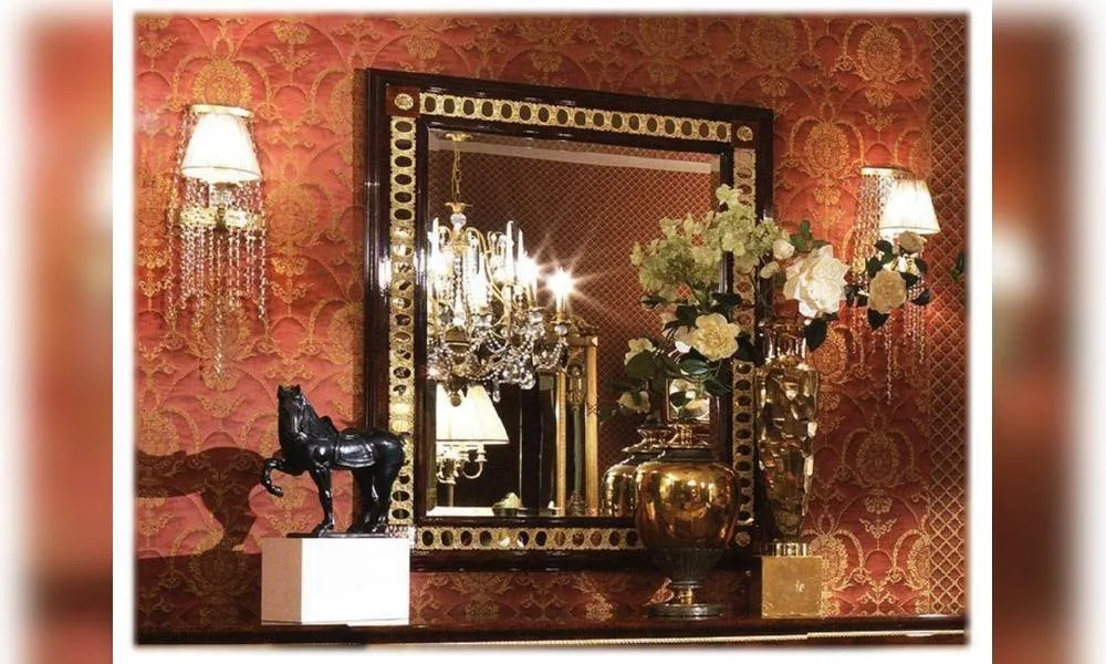 Зеркало c периметральным фацетом. Декоративные металлические детали со встроенными затененными зеркалами. Декор ручной работы. Возможны другие цветовые варианты отделки.
